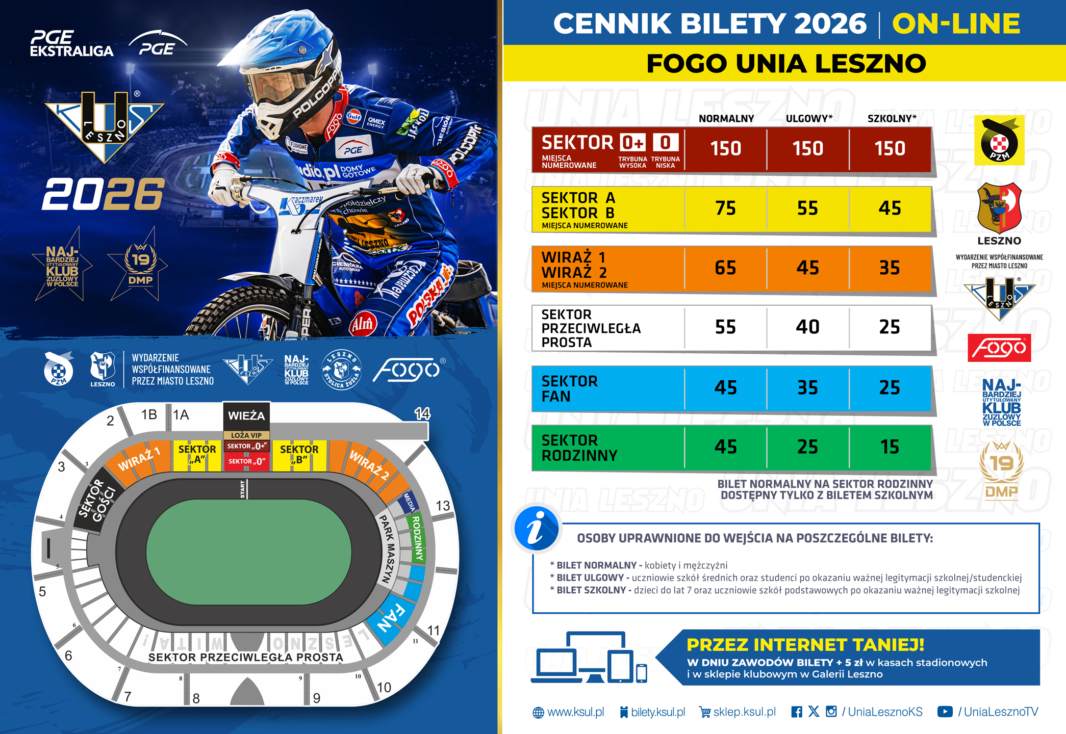 • w kasach biletowych w piątek ( w dniu zawodów bilety droższe o 5 zł! – oprócz biletów dziecięcych, za wyjątkiem sektora „0” )