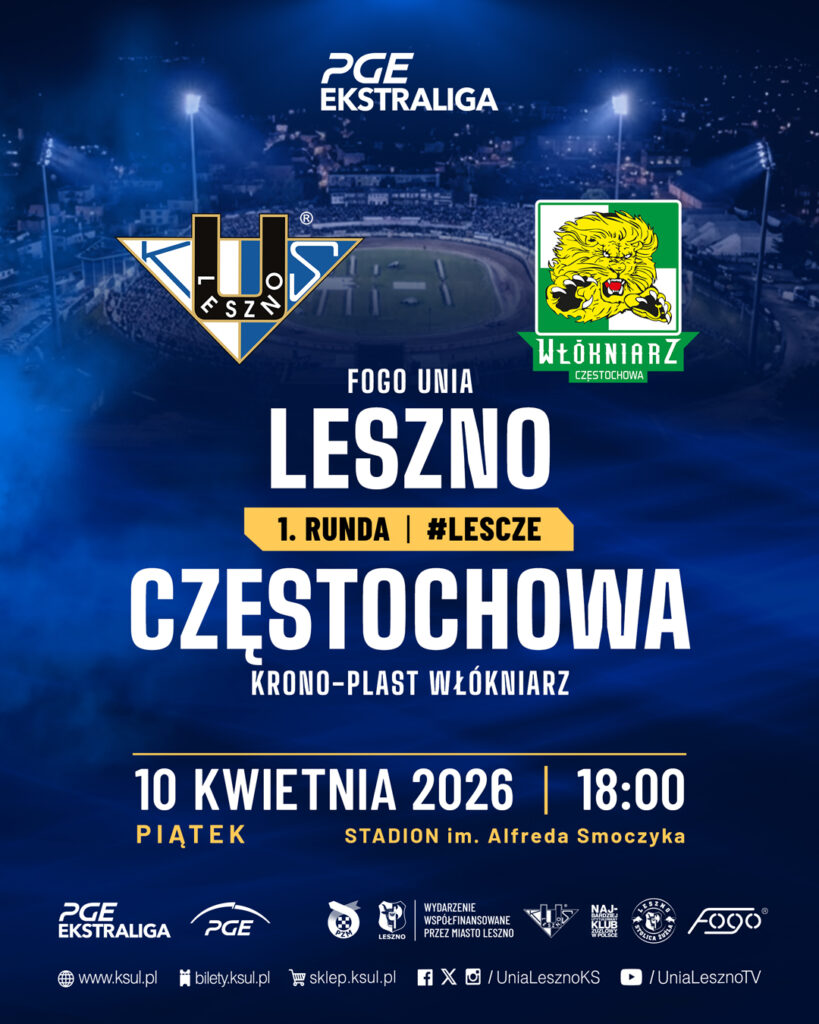 W piątek, 10 kwietnia o godzinie 18:00 FOGO Unia Leszno na stadionie im. Alfreda Smoczyka w inauguracyjnym spotkaniu PGE Ekstraligi 2026 zmierzy się z ekipą KRONO-PLAST Włókniarz Częstochowa. Trwa SPRZEDAŻ BILETÓW na ten pojedynek. Wejściówki można nabyć za pośrednictwem serwisu biletowego www.bilety.ksul.pl ,w klubowym sklepie w Galerii Leszno. W trosce o komfort i bezpieczeństwo podczas zawodów przekazujemy zbiór ważnych informacji organizacyjnych.